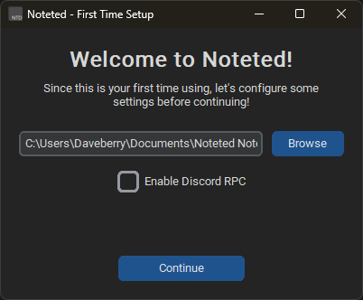 By default, your notes directory goes to ~/Documents/Noteted Notes/.